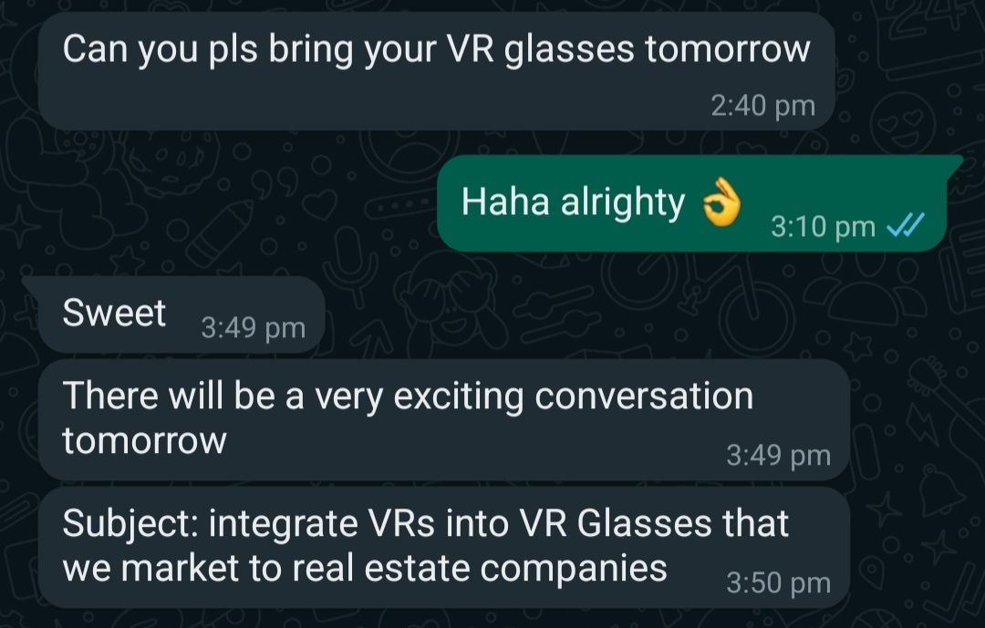 It was 9:20 AM, when he and our salespeople were about to go pitch our new VR tour service to a real estate agency. He asked me 10 minutes before if I could prepare a VR demo with this link: https://my.matterport.com/show/?m=kaxoRfXCZNC&brand=0.